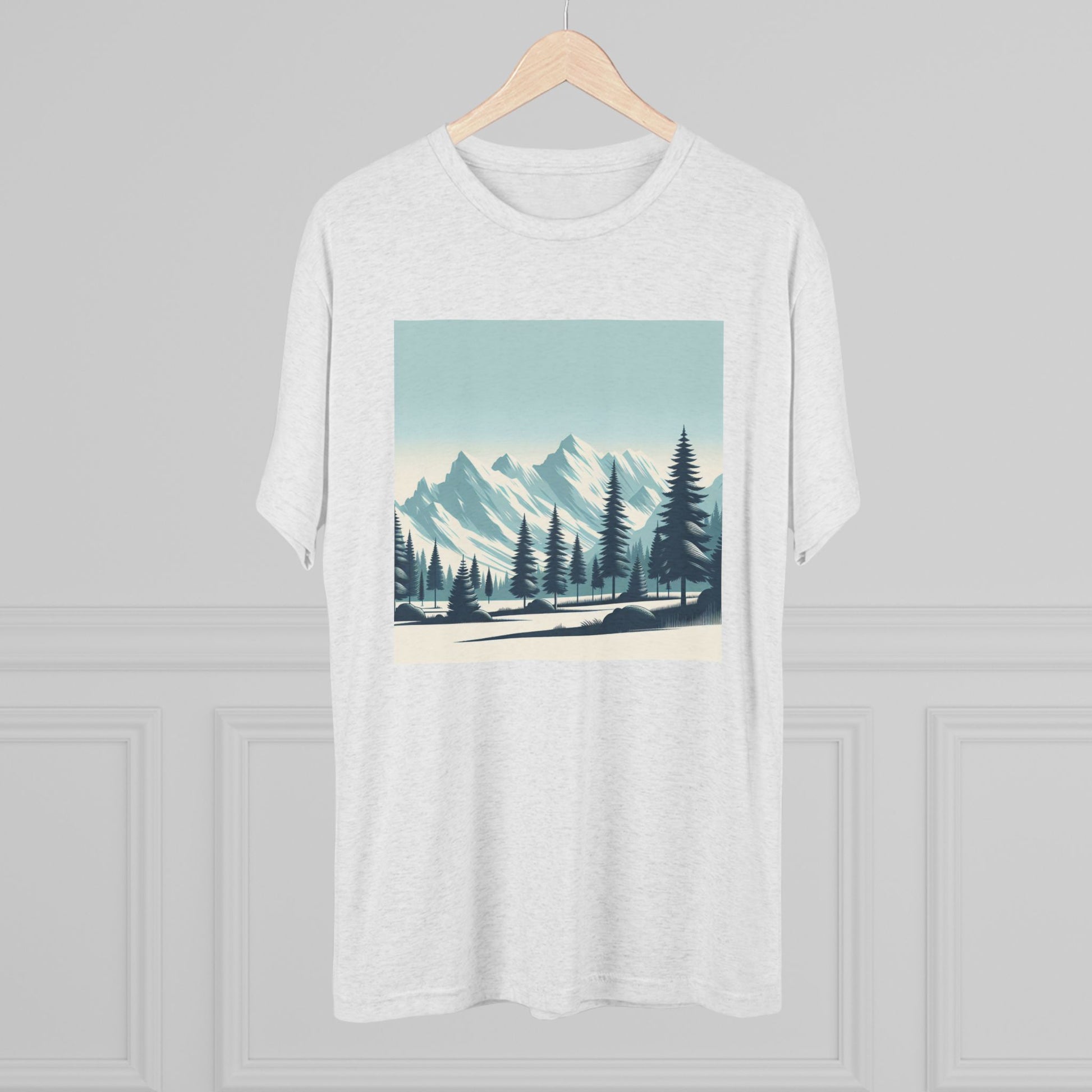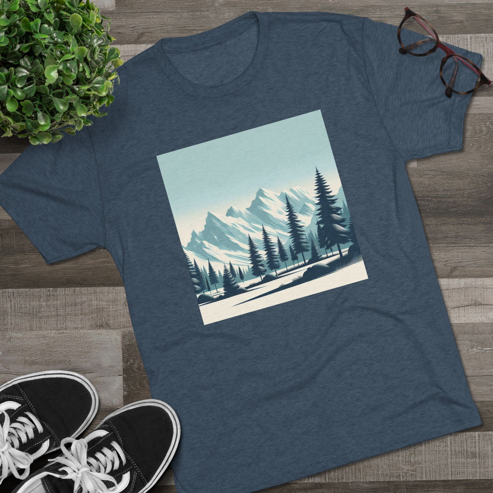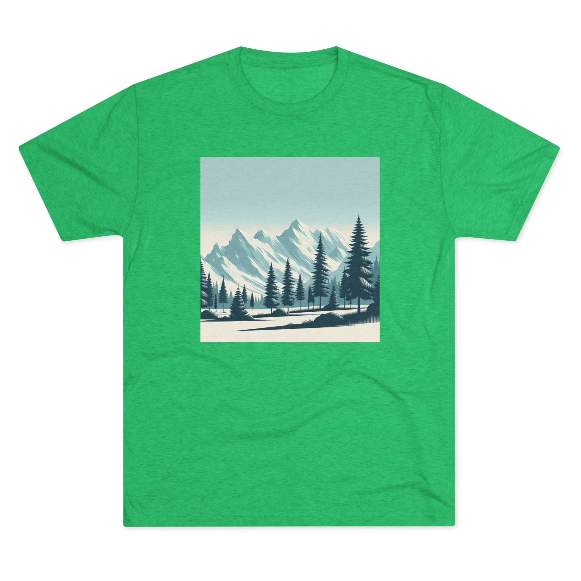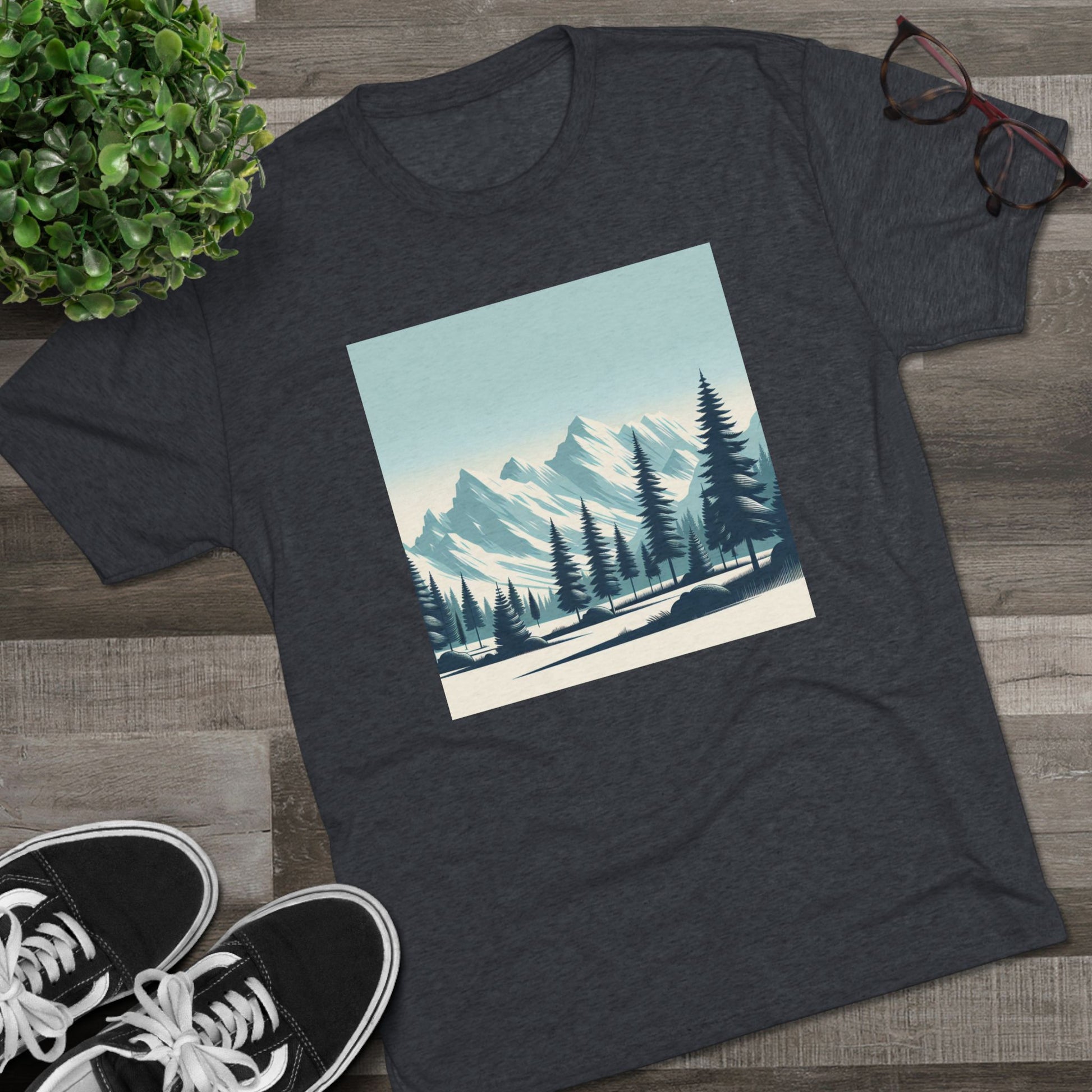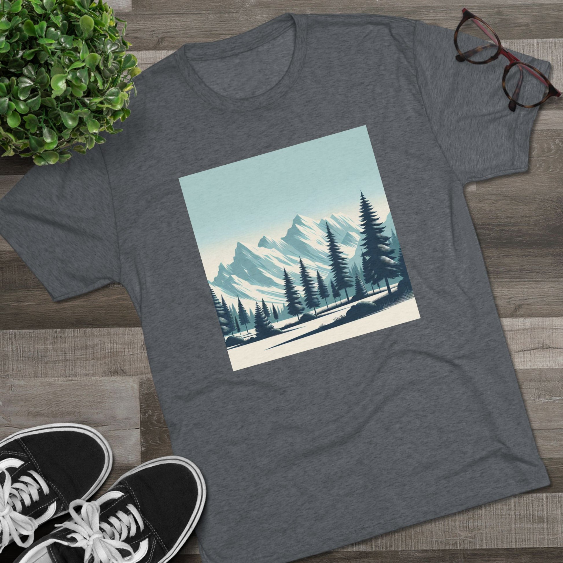 冒険が待っているユニセックストライブレンドクルーTシャツ – スノーウィーマウンテントップス&パインツリーデザイン