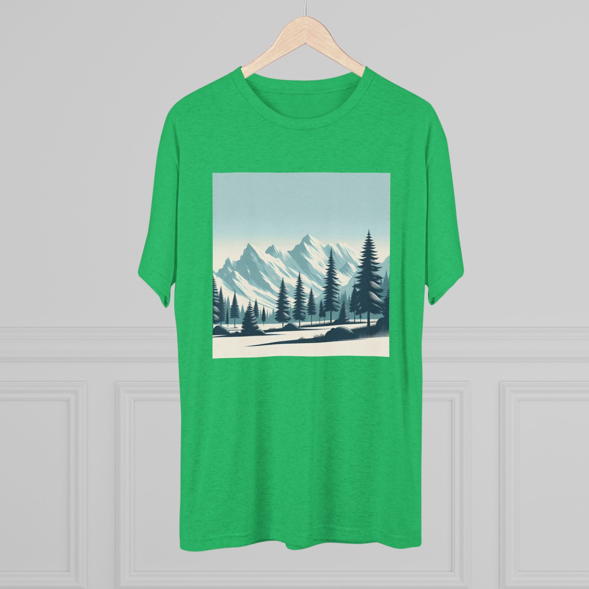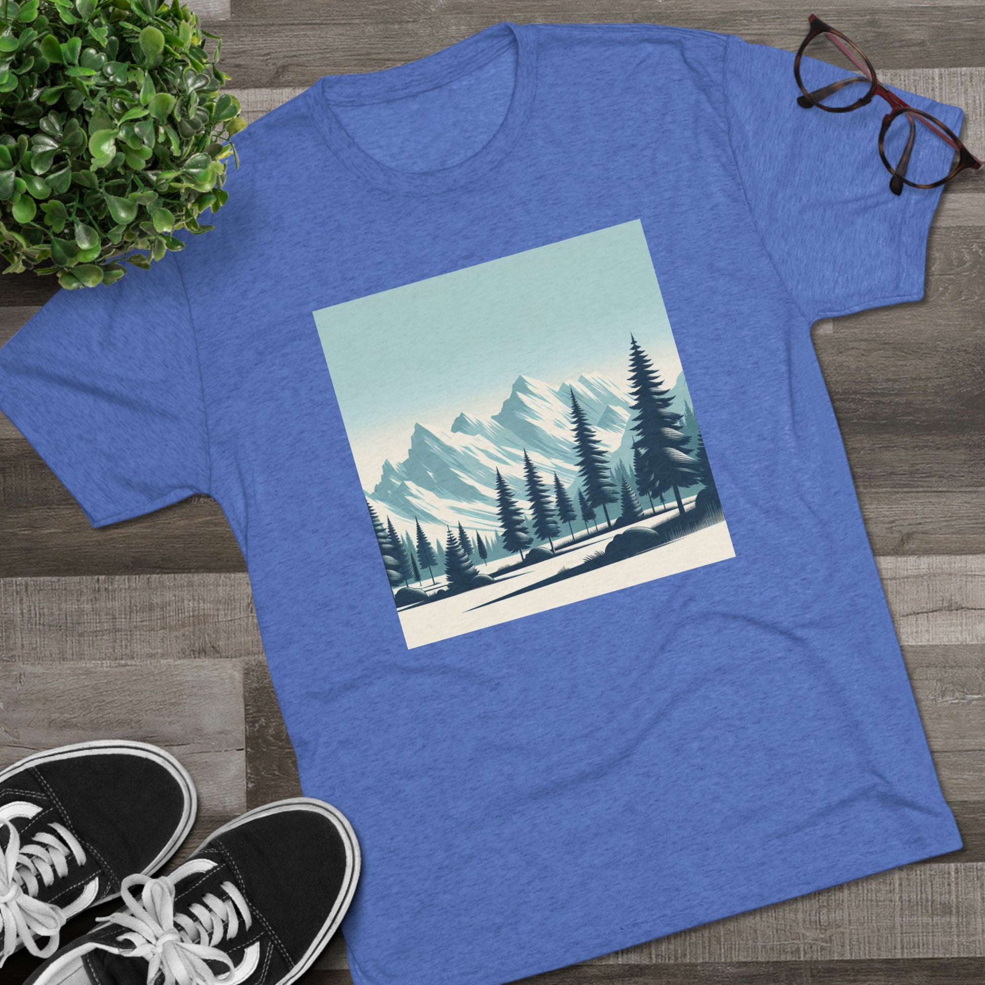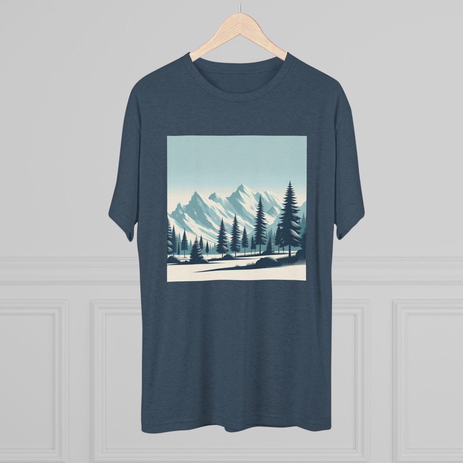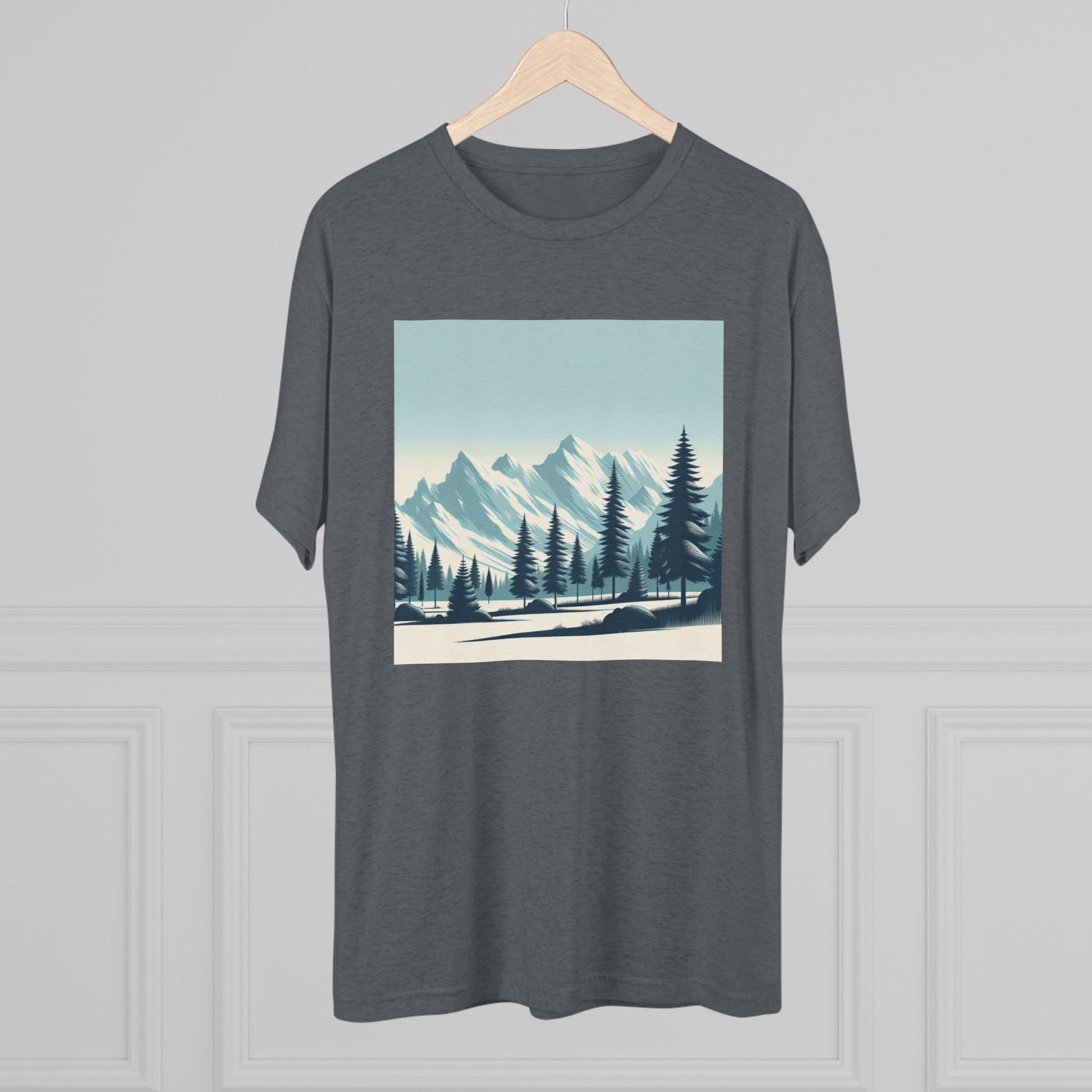 冒険が待っているユニセックストライブレンドクルーTシャツ – スノーウィーマウンテントップス&パインツリーデザイン
